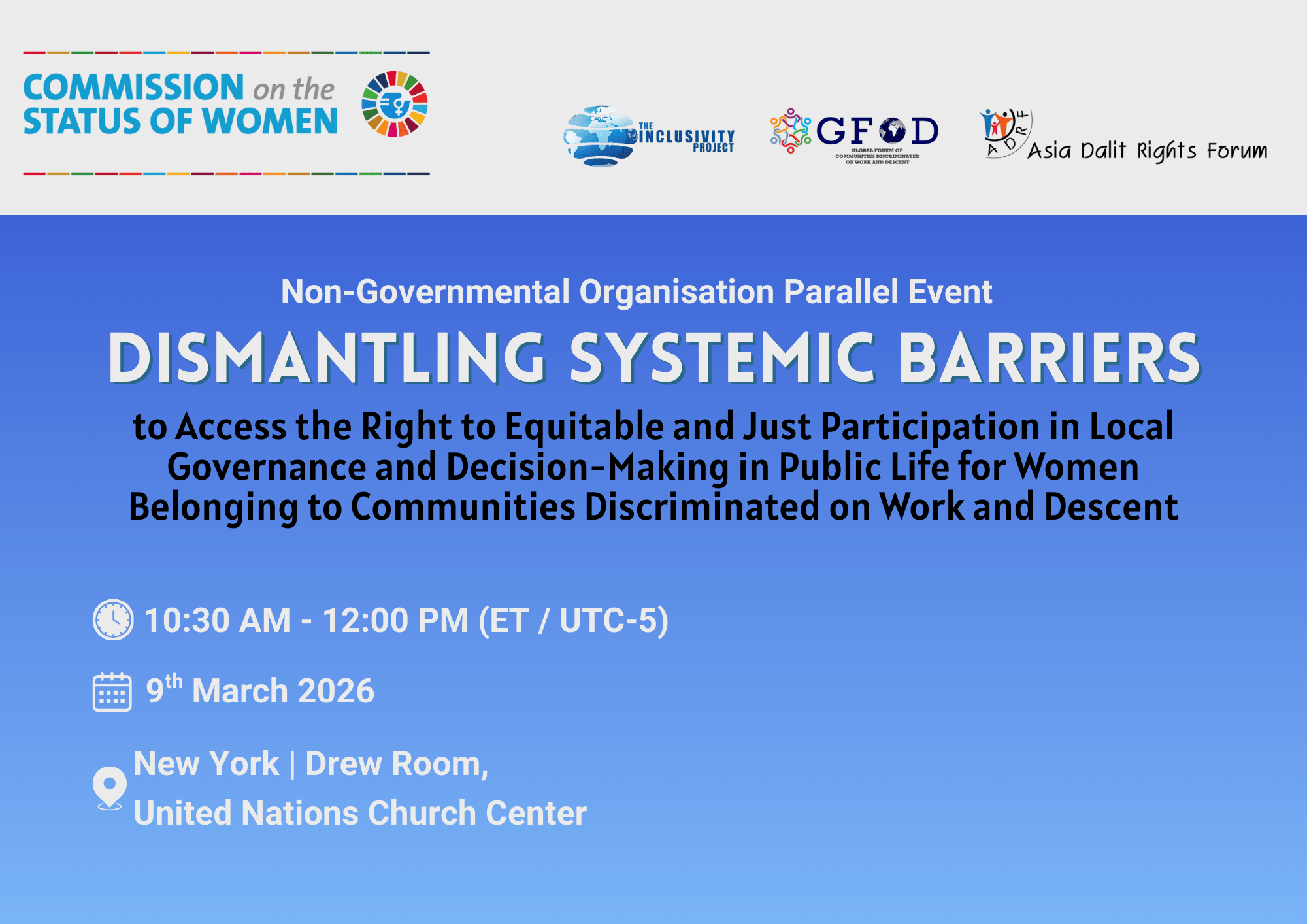 The Asia Dalit Rights Forum, in collaboration with the The Inclusivity Project, Feminist Dalit Organisation (FEDO Nepal), and Dalit Women Forum/Nagorik Uddyog, will host an in-person parallel event during CSW70.